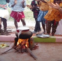 Die Dorfgemeinschaft holte uns bei den Autos ab und wir wurden tanzend ins neue Dorfzentrum geleitet. Die große Freude der Dorfbewohner war sofort spürbar. Das Dorfzentrum wurde mit einer hinduistischen Zeremonie eingeweiht. Auch wurde Milch in einem Topf zum Überkochen gebracht. Je nachdem, in welche Richtung die Milch läuft, kann nach hinduistischer Vorstellung vorausgesagt werden, welches Schicksal dem Dorfzentrum beschieden ist. Es gab Ansprachen von offizieller Seite und dem Dorfvorsteher. Am Ende des Festes durften wir gemeinsam mit den Kindern Bäume im noch nicht angelegten Garten pflanzen. Am Abend kehrten wir erschöpft, aber sehr fröhlich, in unser Hotel zurück.