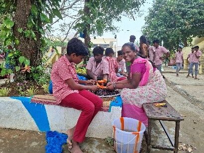 Am nächsten Morgen ging es dann schon los und wir wurden mit zwei Autos nach Puthur gebracht. Hier haben wir das Dorfzentrum besucht und wurden herzlichst begrüßt. Die engagierten Lehrerinnen und die herzlichen Kinder machten uns das Ankommen leicht. Die Kinder führten uns vor, was sie schon alles gelernt hatten. Und dies mit zum Teil einfachsten Mitteln, wie selbst gebastelte Lehrmittel aus Pappe.